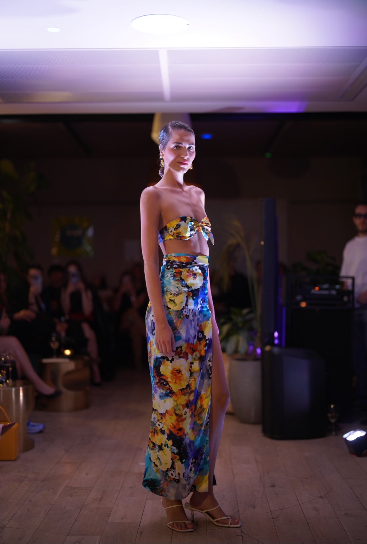 Molini Resort | The Alessia skirt is designed with a bold painterly print in vibrant yellows, blues, and deep inky tones. The high-slit cut adds a sensual edge, balancing elegance with modern allure. Crafted from lustrous dead-stock floral silk, it flows beautifully with movement, making it perfect for elevated resort wear or evening occasions.