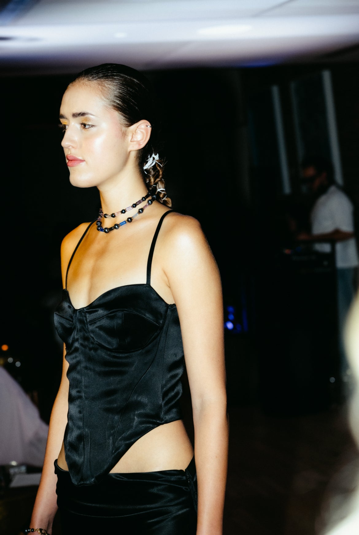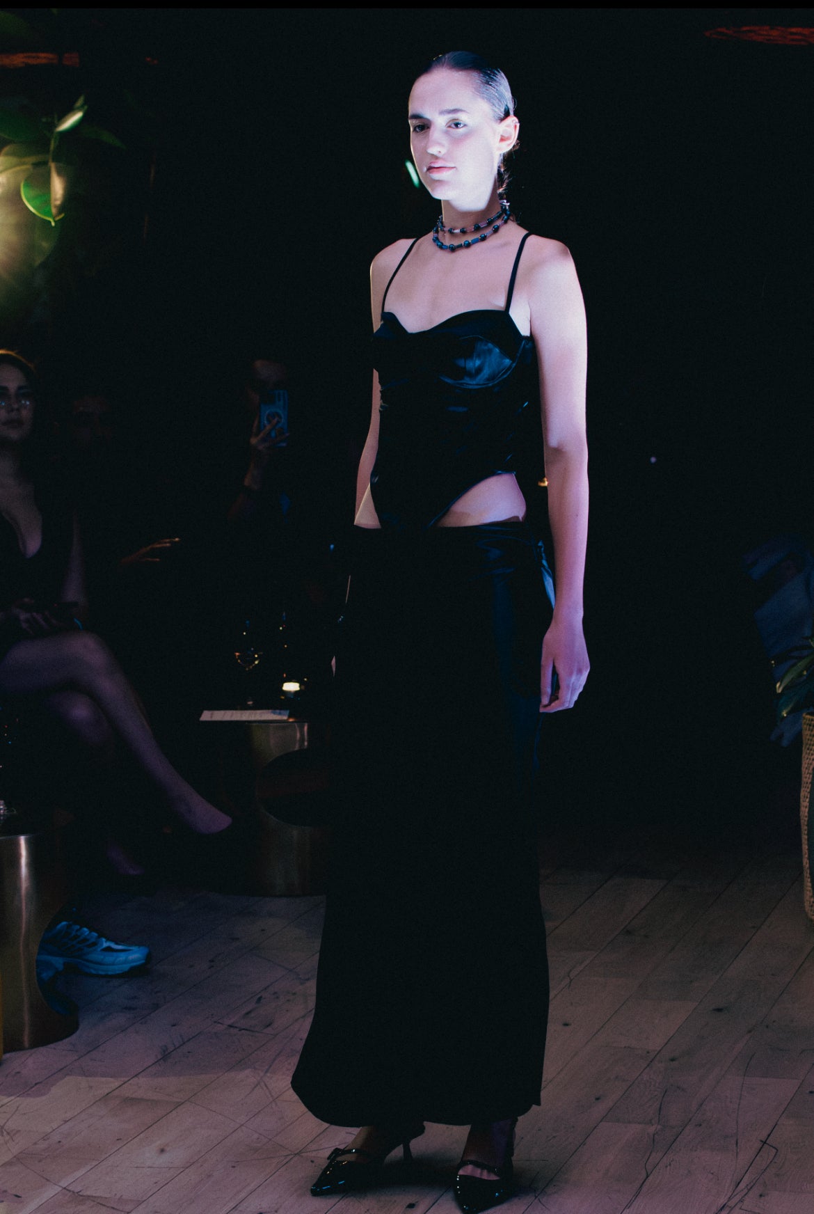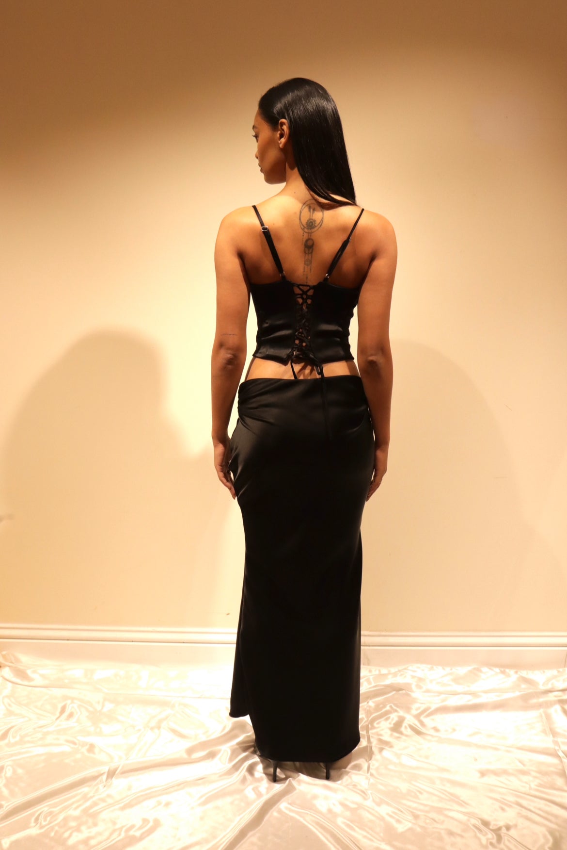 The revised Bella corset, in black, is a modern interpretation of timeless elegance, designed with a sculpted bustier silhouette and delicate adjustable straps. Its smooth satin finish and contouring seams enhance the figure, while the dramatic lace-up back offers a customizable fit with an alluring edge. Sleek yet sensual, it’s a versatile statement piece that pairs effortlessly with tailored trousers or flowing skirts.