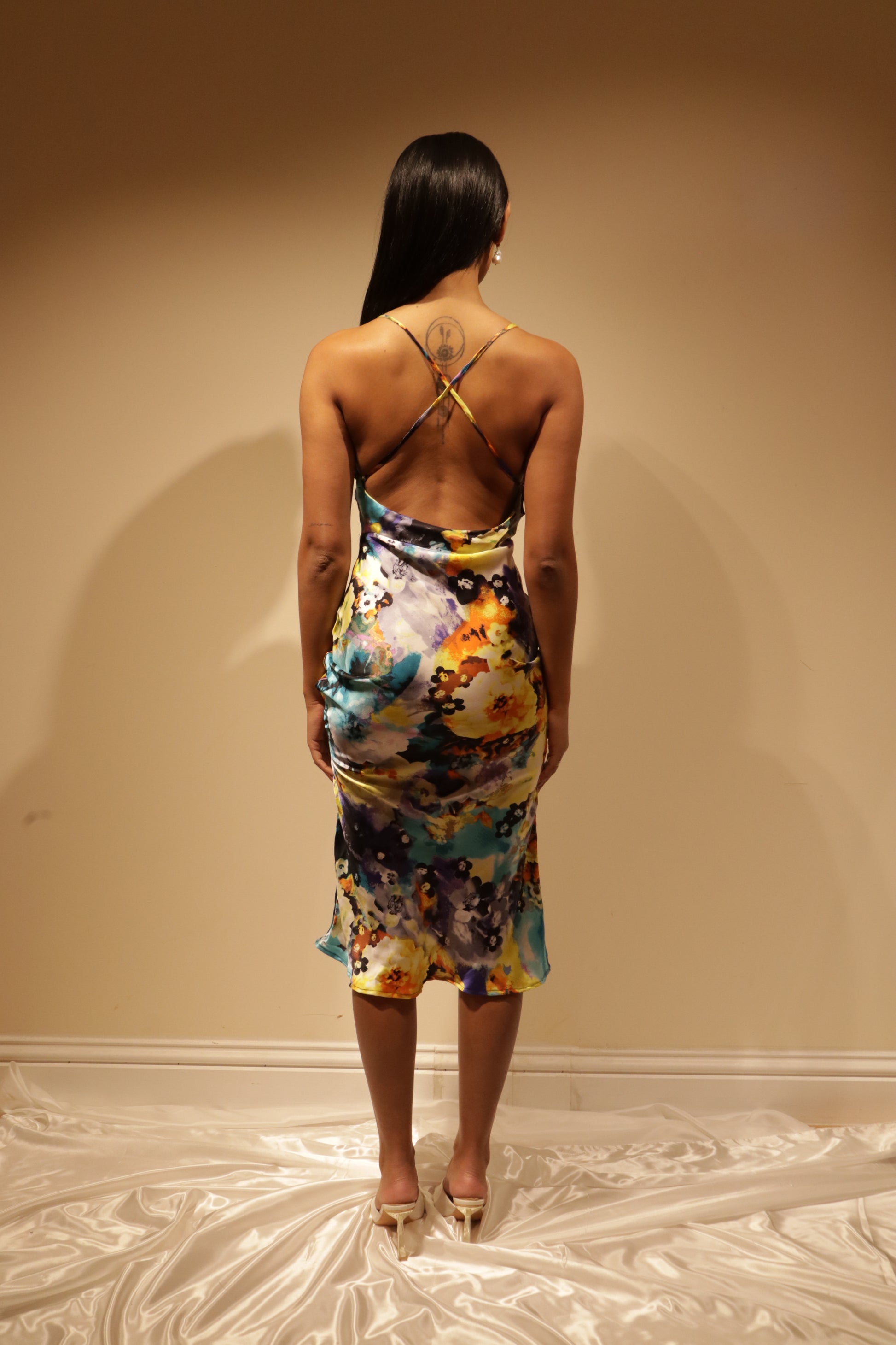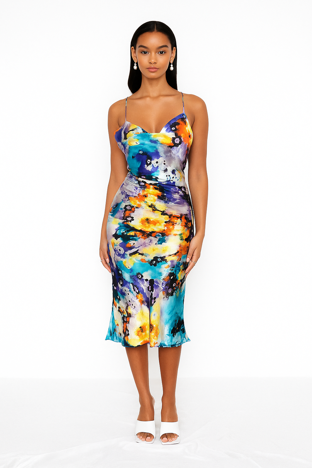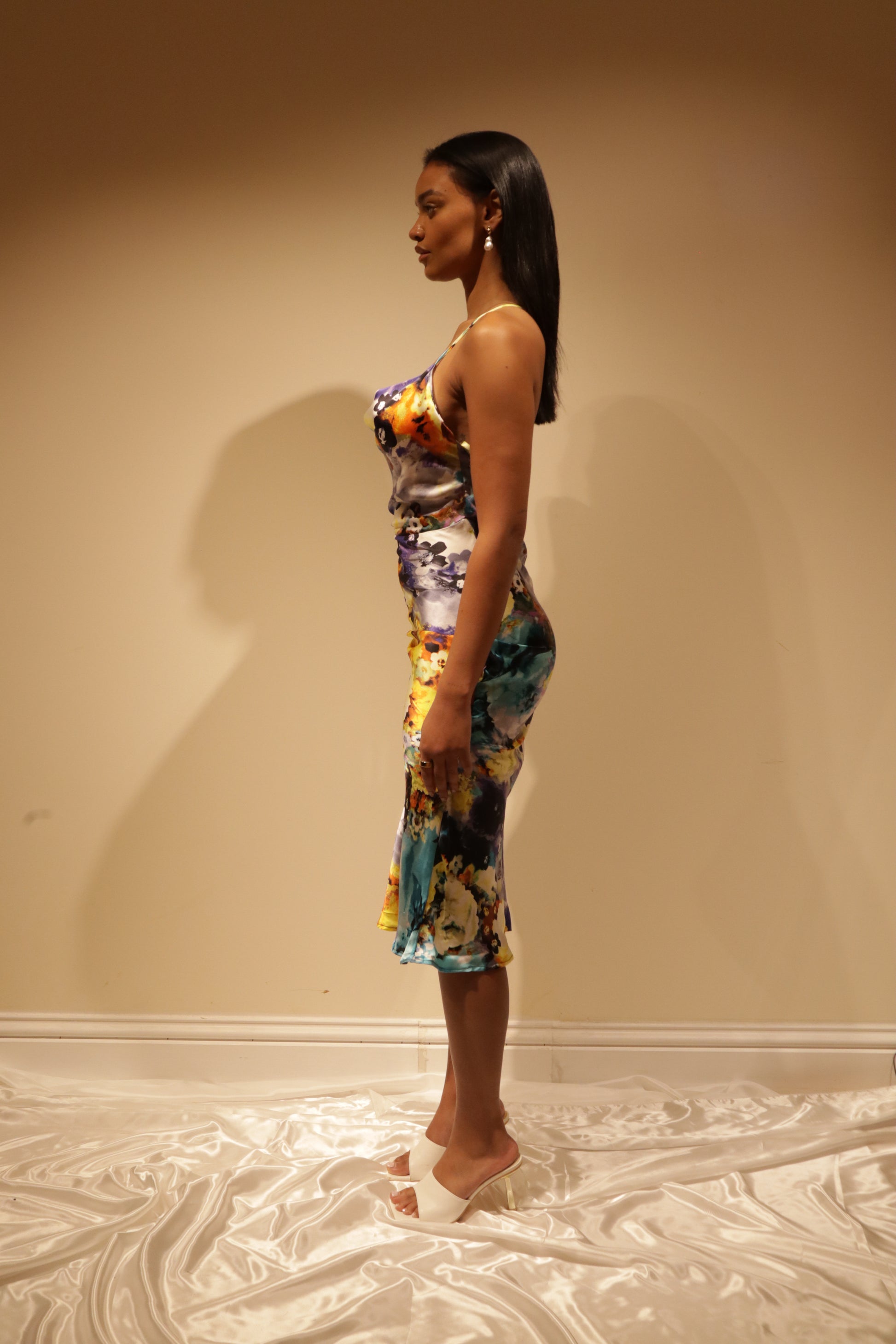 The resort version of our best seller, the Ivory coloured Camille Slip. Perfect for resort wear or for a colourful mood. Made from locally sourced deadstock silk-satin fabric. Made in London. Modelled by a size 8 UK.