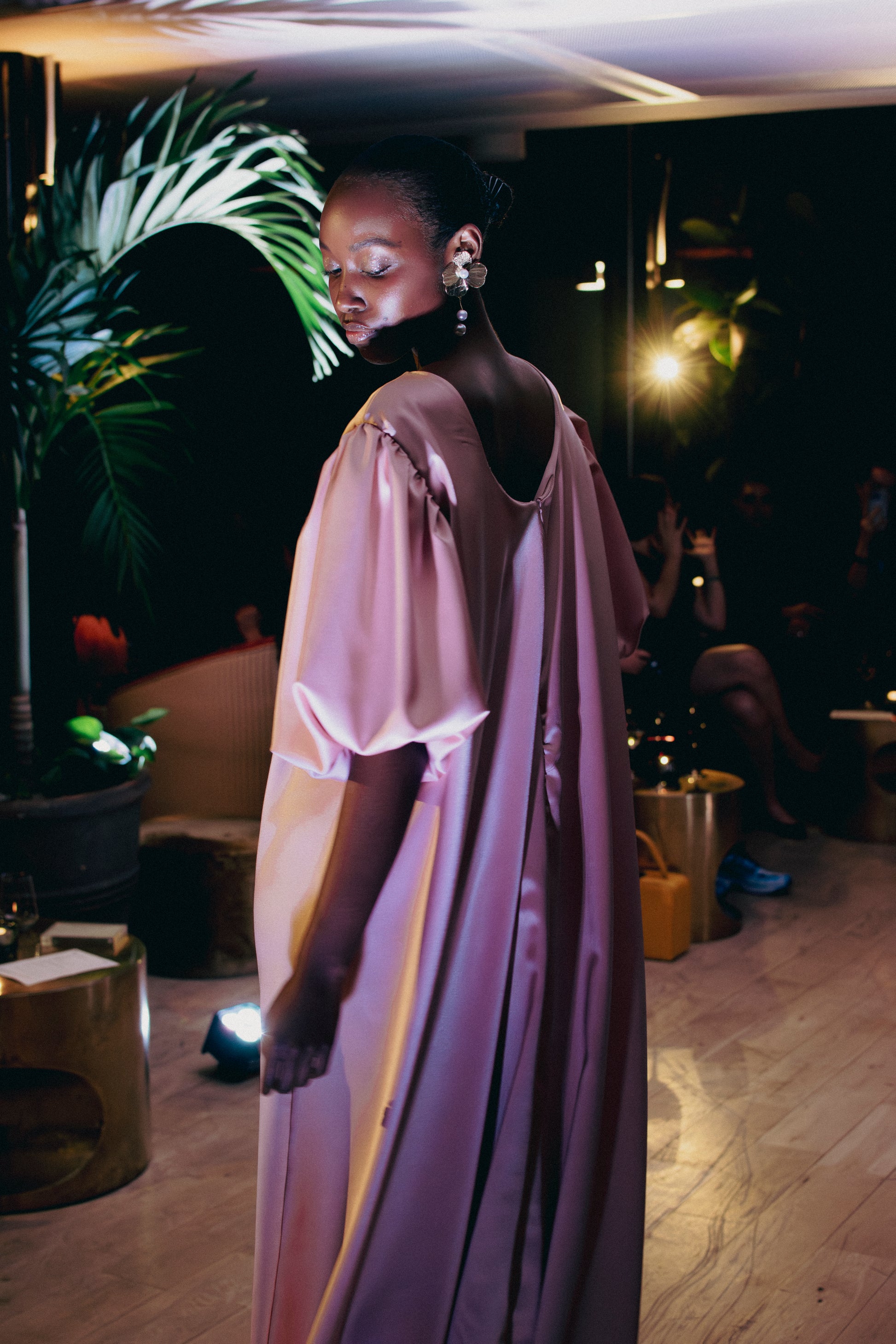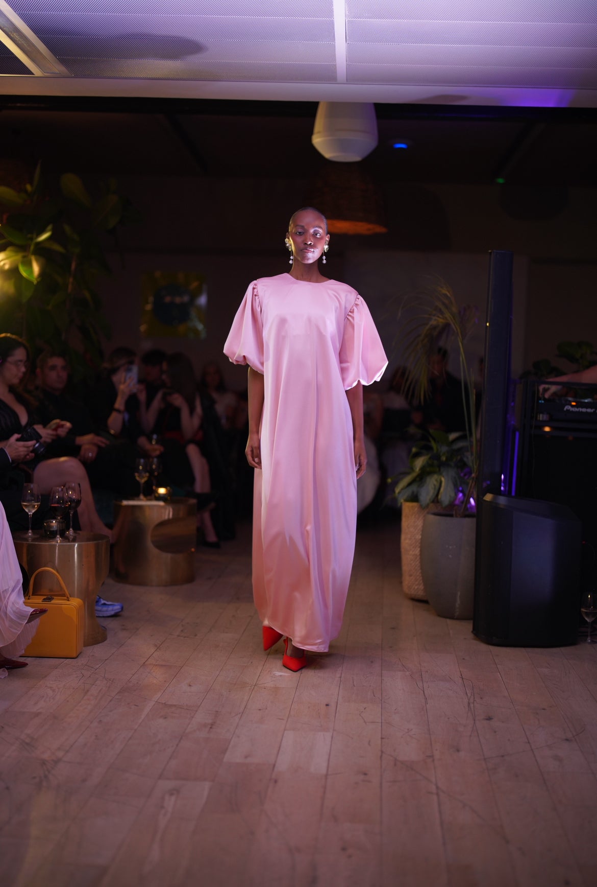 The pink silk gown of your dreams. This floor-length gown exudes effortless elegance with its fluid drape and refined sheen. The voluminous silhouette is enhanced by soft, billowing sleeves that fall gracefully to the elbow, while a subtle low back adds a touch of sensuality. Its minimalist cut allows the luxurious fabric to take center stage, catching the light with every movement. A statement in modern sophistication, this piece is designed for those who seek timeless glamour with a contemporary edge.