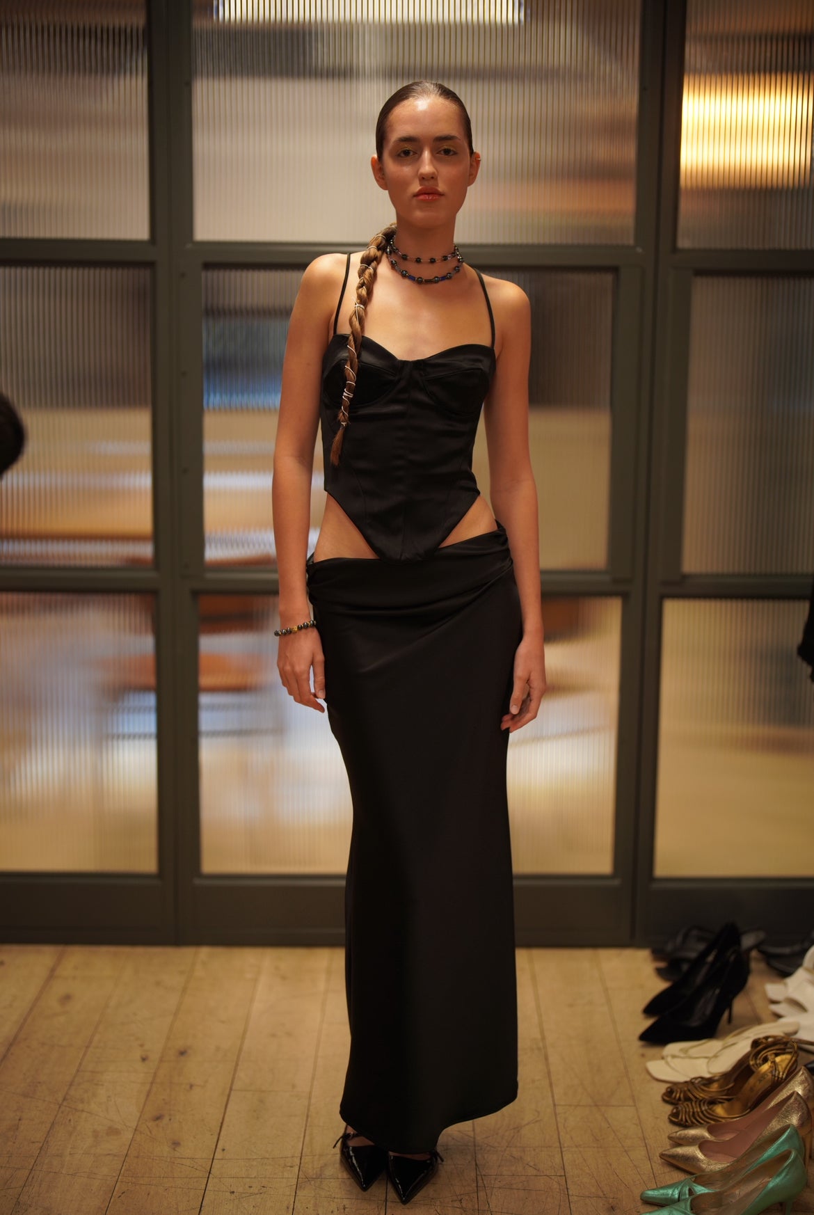 The Chiara long silk skirt embodies modern sophistication with a fluid, floor-skimming silhouette. Its soft and shiny finish catches the light beautifully, while the sleek low-rise cut adds an edge of contemporary allure. Designed to move effortlessly, it pairs perfectly with both structured corsets and delicate evening tops. A versatile statement piece for elegant nightwear or elevated occasion dressing
