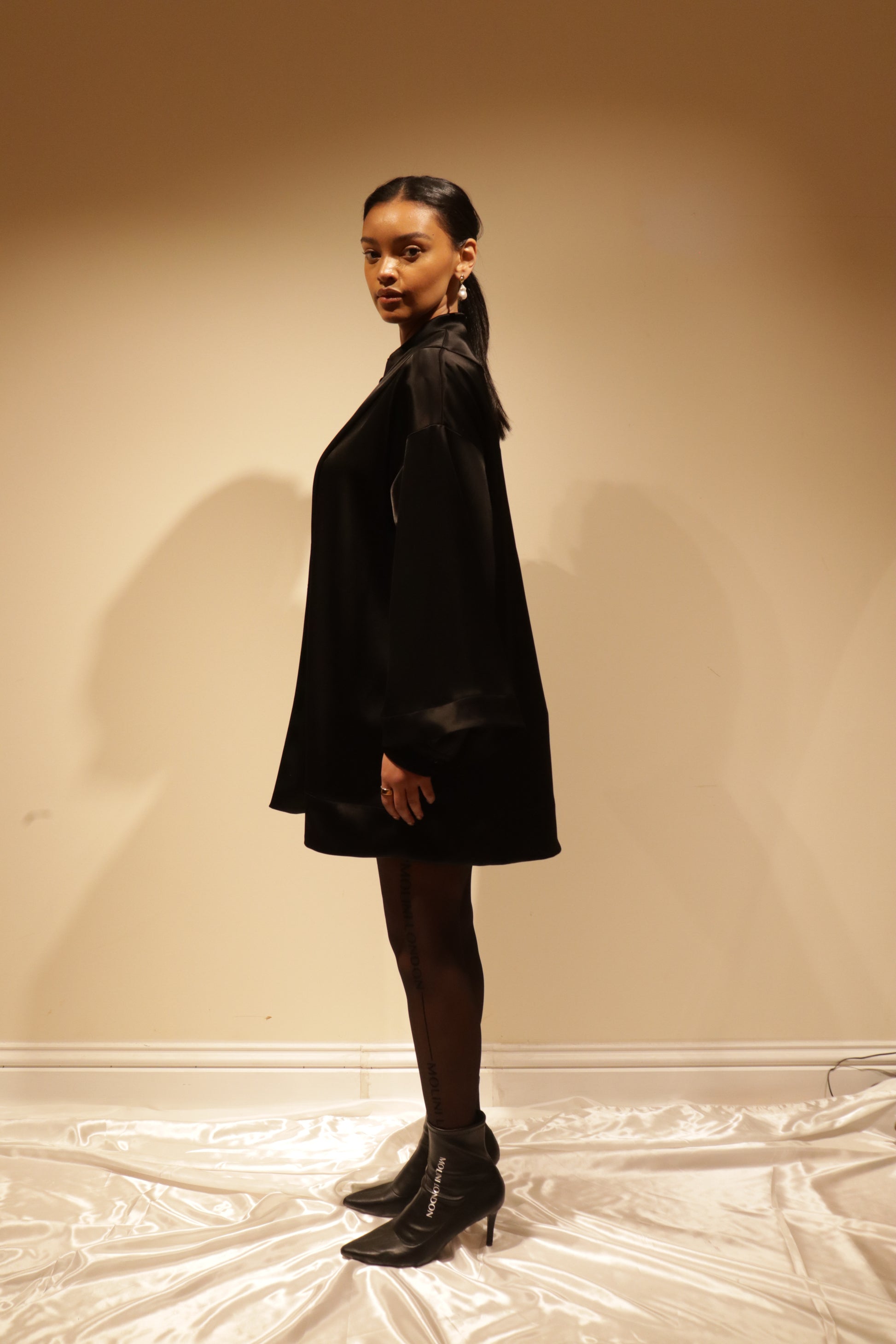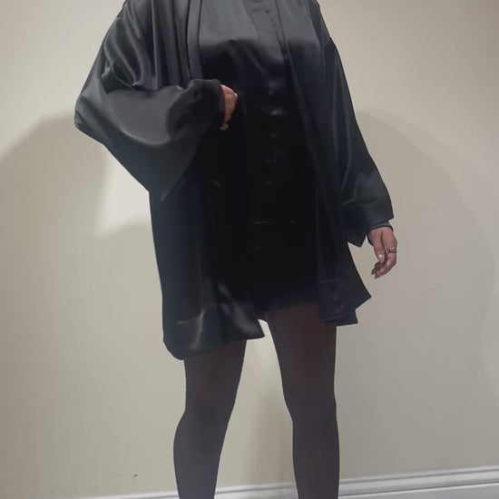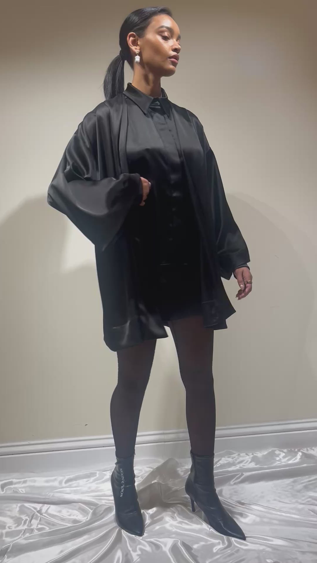 This oversized kimono shirt is cut from lustrous black silk, offering a fluid drape with an elegant, minimalist silhouette. Designed with dropped shoulders and wide sleeves, it balances structure and ease for a refined modern look. Its luxurious sheen elevates the piece, making it versatile for both eveningwear and elevated day styling. A timeless statement in understated sophistication.