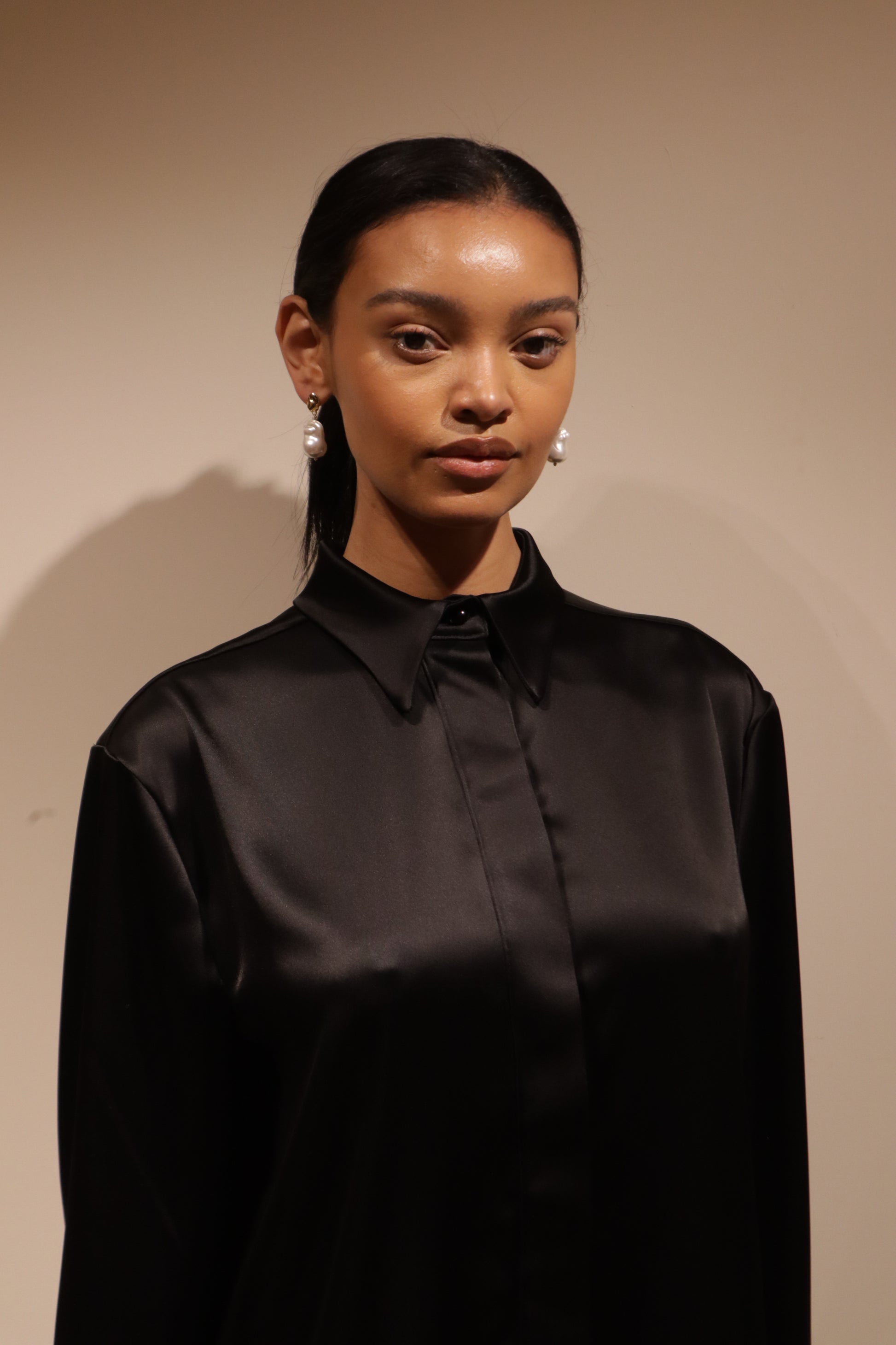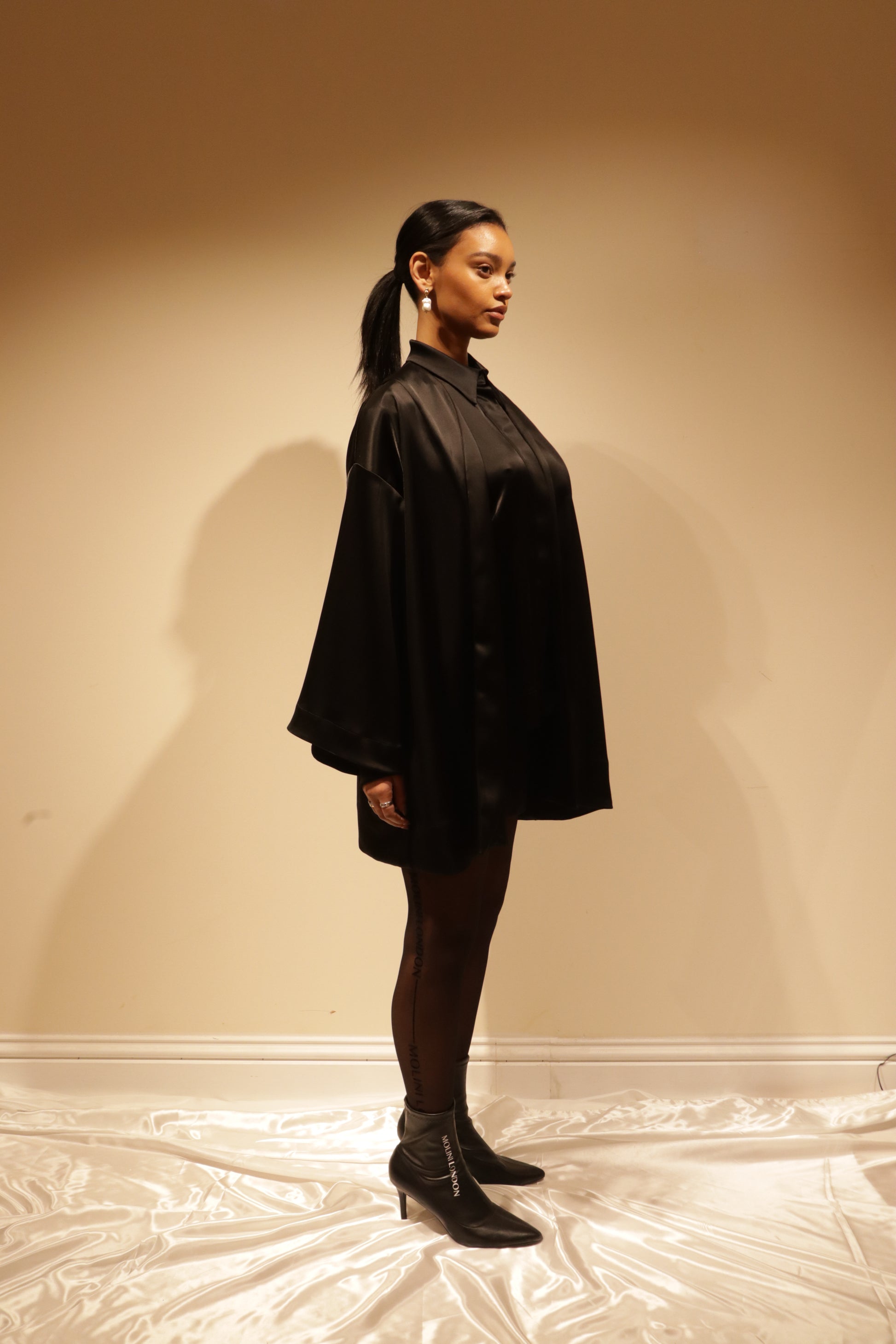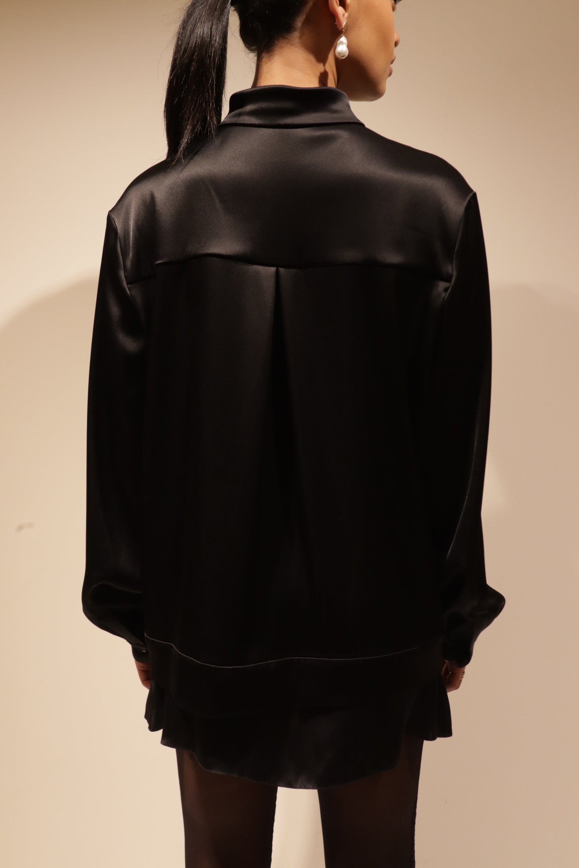 Crafted from lustrous black silk, this shirt offers a sleek, fluid silhouette with a modern edge. The concealed placket and sharp collar create a clean, refined finish, while its relaxed cut ensures versatile styling. Elevated yet effortless, it transitions seamlessly from day to evening. A timeless staple for the contemporary luxury wardrobe. Comes with Invisible buttons, a mildly flared fit and can be worn by itself with tights, skirt, other.