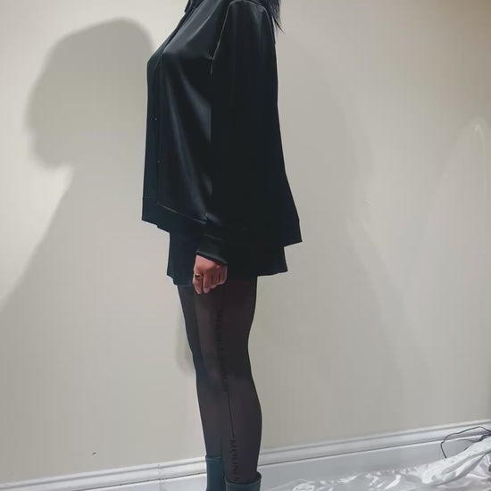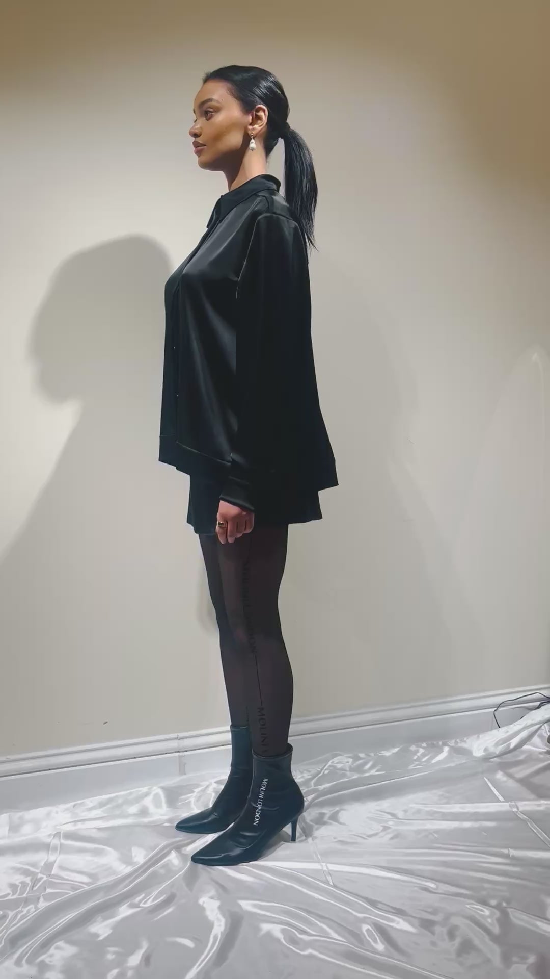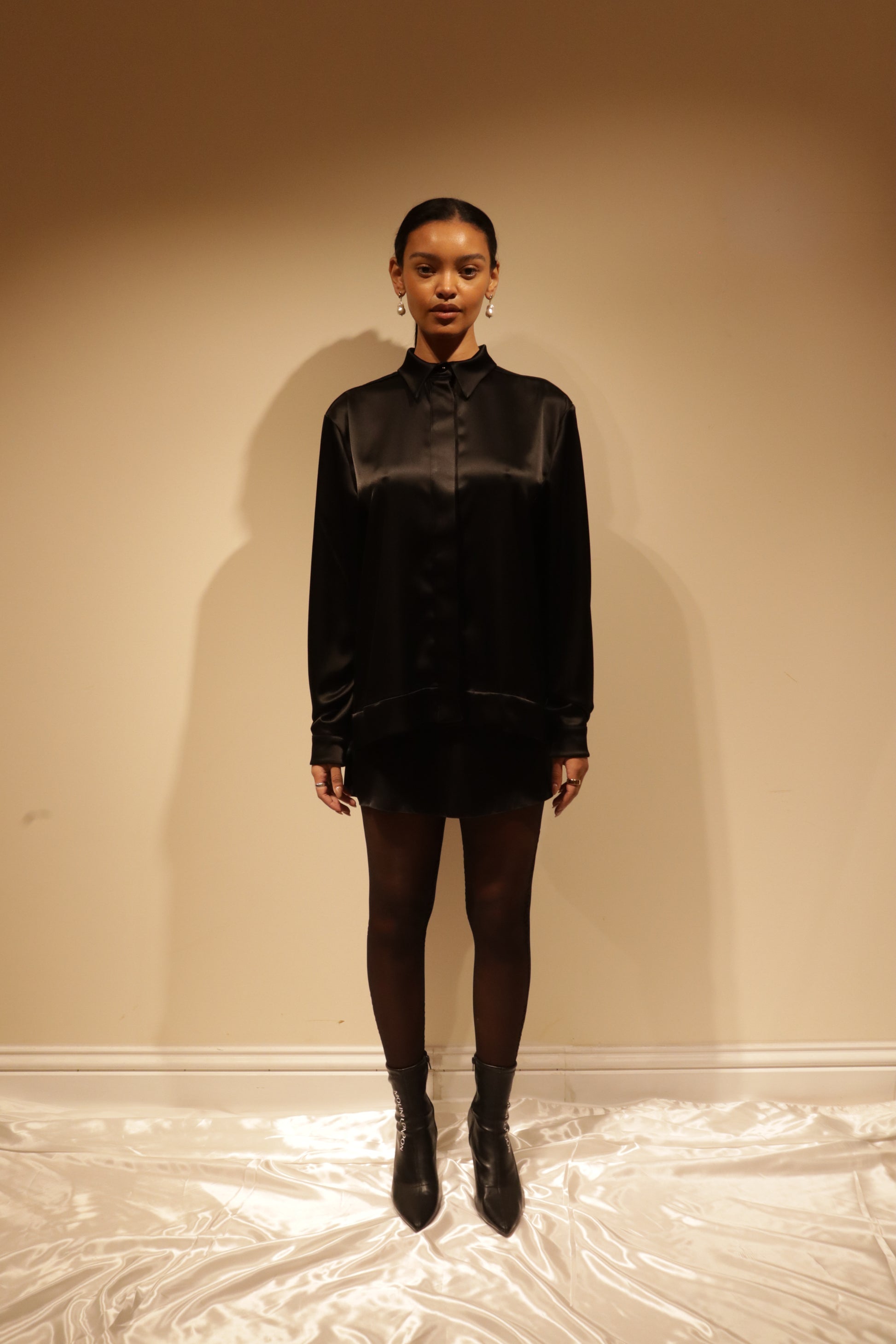 Crafted from lustrous black silk, this shirt offers a sleek, fluid silhouette with a modern edge. The concealed placket and sharp collar create a clean, refined finish, while its relaxed cut ensures versatile styling. Elevated yet effortless, it transitions seamlessly from day to evening. A timeless staple for the contemporary luxury wardrobe. Comes with Invisible buttons, a mildly flared fit and can be worn by itself with tights, skirt, other.